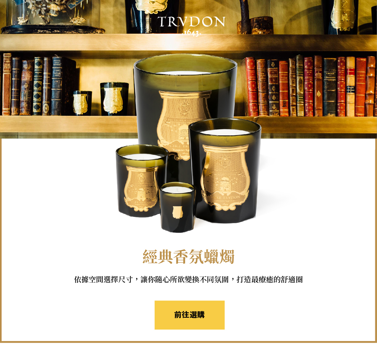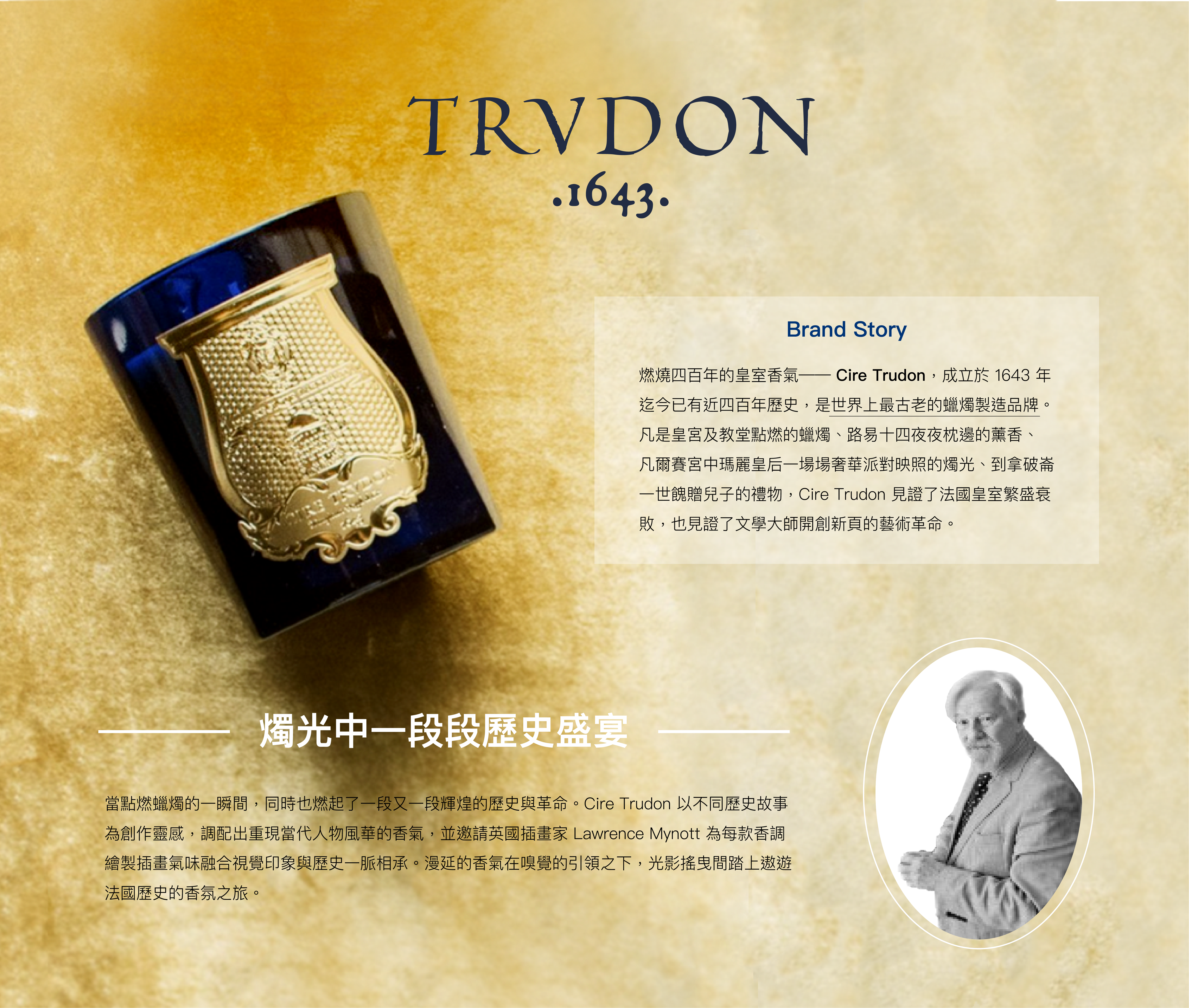 創立於1643年,為法國王室指定御用香氛蠟燭品牌,見證皇室生活與法國歷史至今仍堅持純天然成分,以百分之百純棉作棉芯,不使用人工石蠟取代椰核、大豆、棕櫚油等植物素材。義大利Vinci工匠所製造的玻璃瓶身,貼有法國香檳廠出品的金色浮雕,延續百年工藝氛圍。現今更是Herme’s、Cartier、Dior、Kenzo 等國際精品合作的唯一香氛用品。