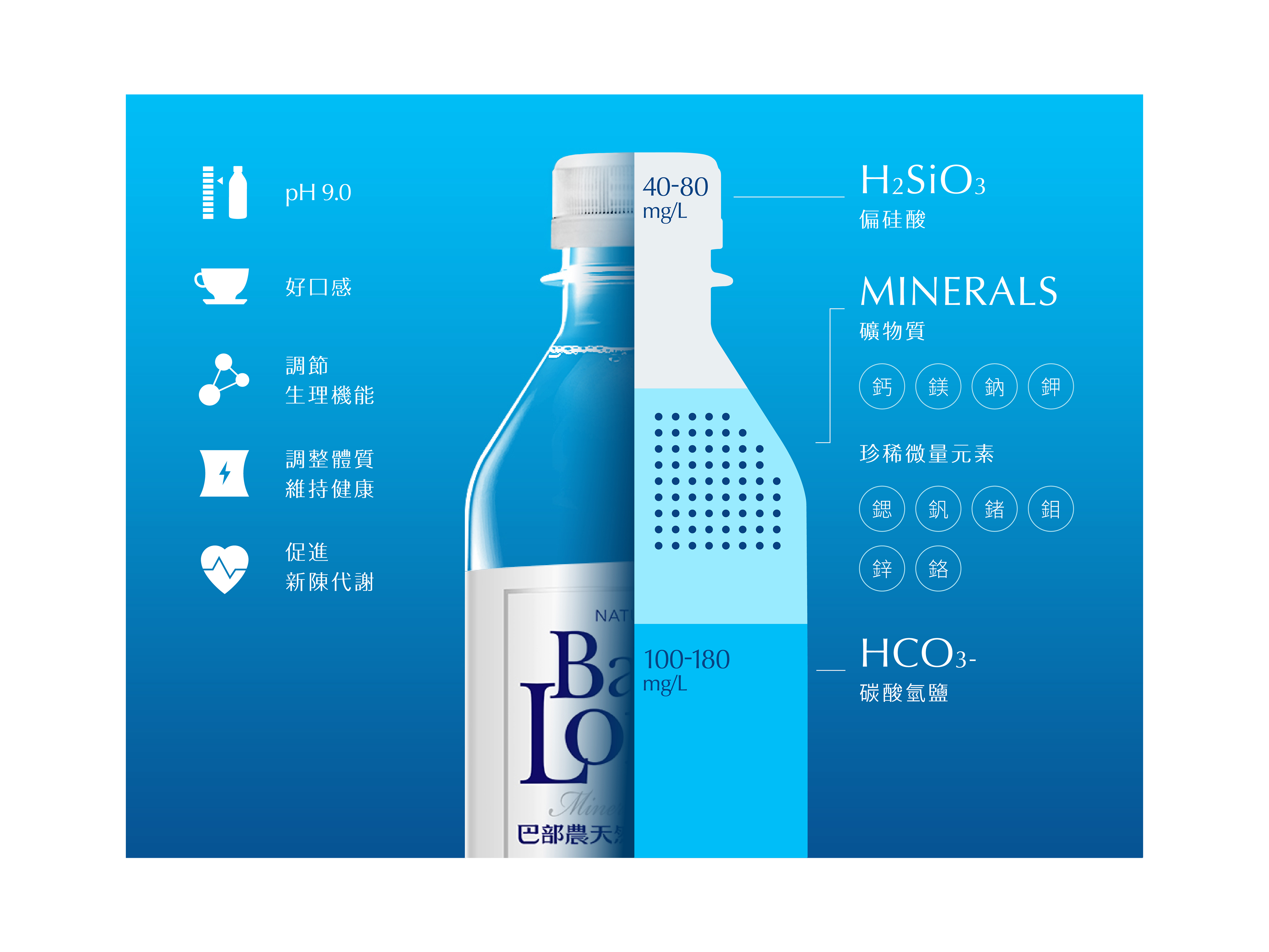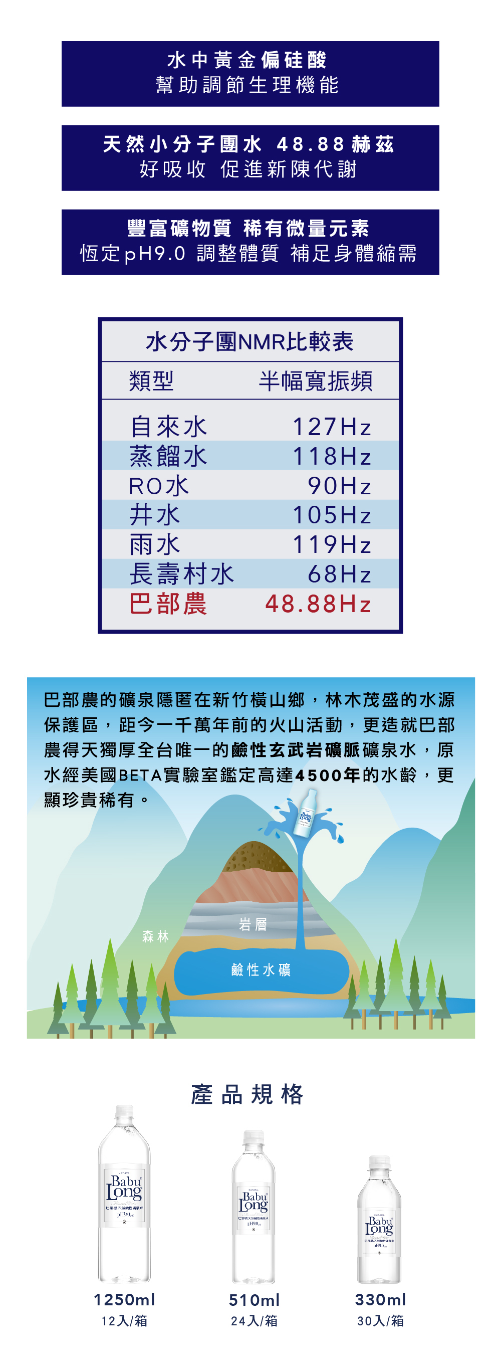 水中黃金,來自中央山脈雪山脈系,pH9.0天然鹼性礦泉水,萬年玄武岩精粹,4500年天然佳釀。