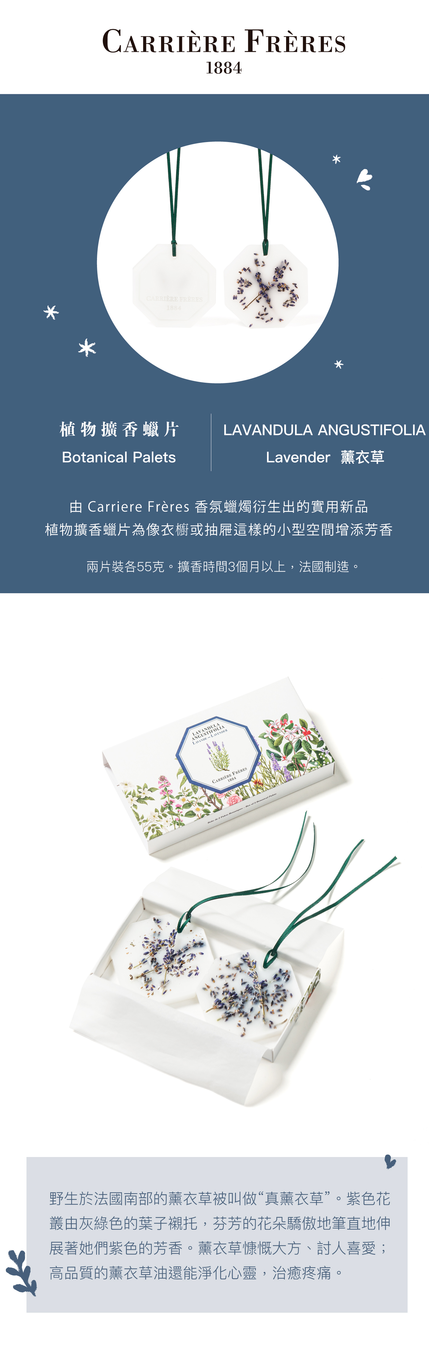 每一片 Botanical Palet 植物香氛蠟片皆在法國諾曼第工坊以 100% 植物蠟手工澆鑄,將真實的花葉、木片與草本植入其中,成為可置於衣櫥、抽屜、浴室或小空間的擴香品。