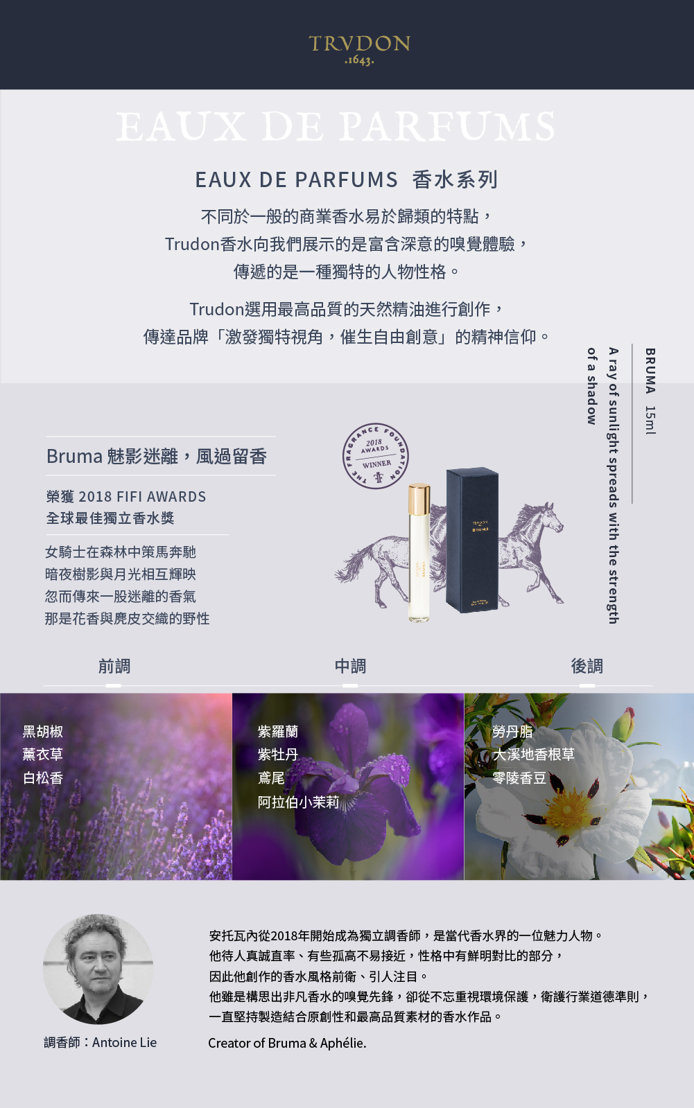 創立於 1643 年的法國皇室香氛品牌 Trudon,選用最高品質的天然精油進行創作,傳達品牌「激發獨特視角,催生自由創意」的精神信仰,Trudon 香水展示的是富含深意的嗅覺體驗,傳遞的是一種獨特的人物性格。