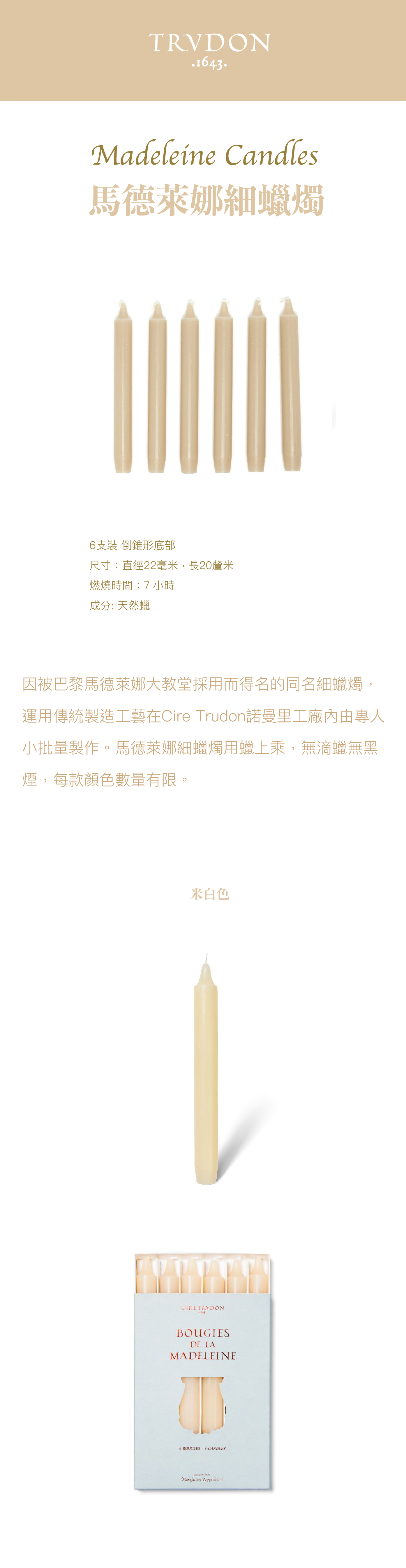 馬德萊娜細蠟燭用蠟上乘,無滴蠟無黑煙,每款顏色數量有限。
