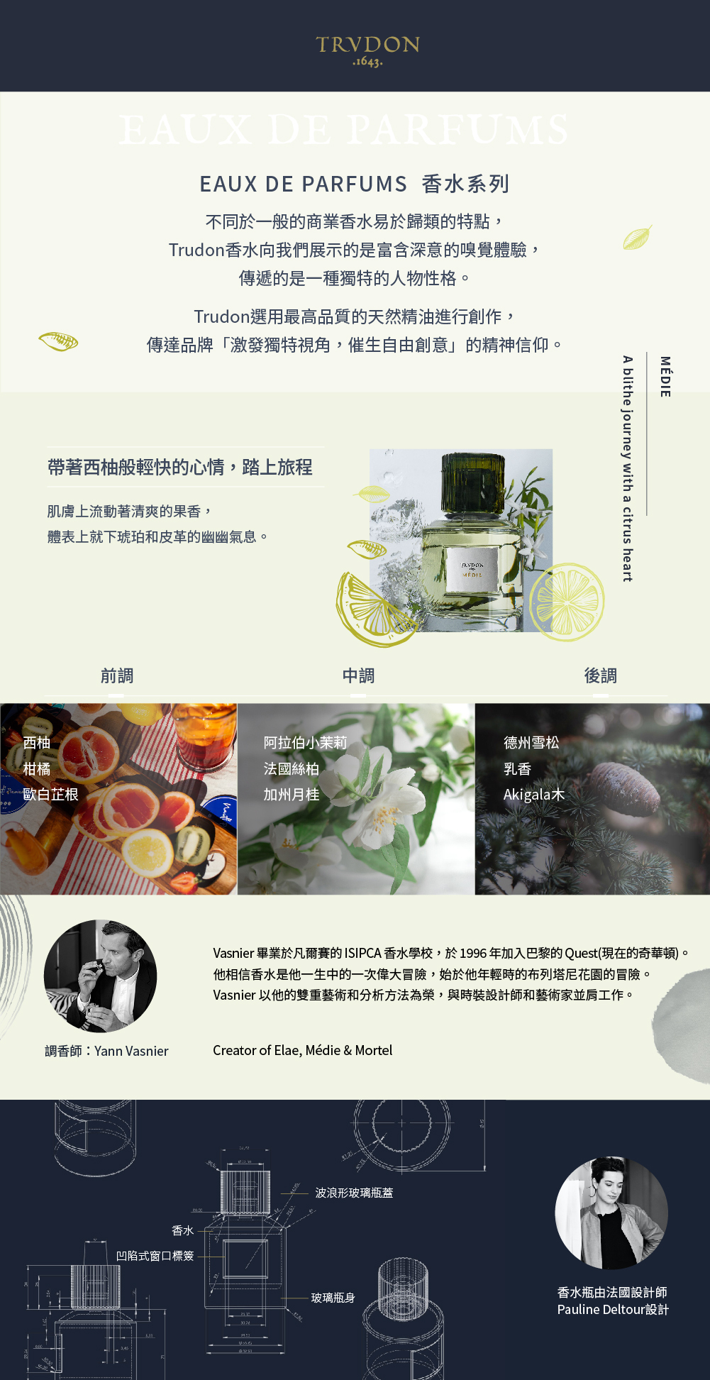 創立於 1643 年的法國皇室香氛品牌 Trudon,選用最高品質的天然精油進行創作,傳達品牌「激發獨特視角,催生自由創意」的精神信仰,Trudon 香水展示的是富含深意的嗅覺體驗,傳遞的是一種獨特的人物性格。
