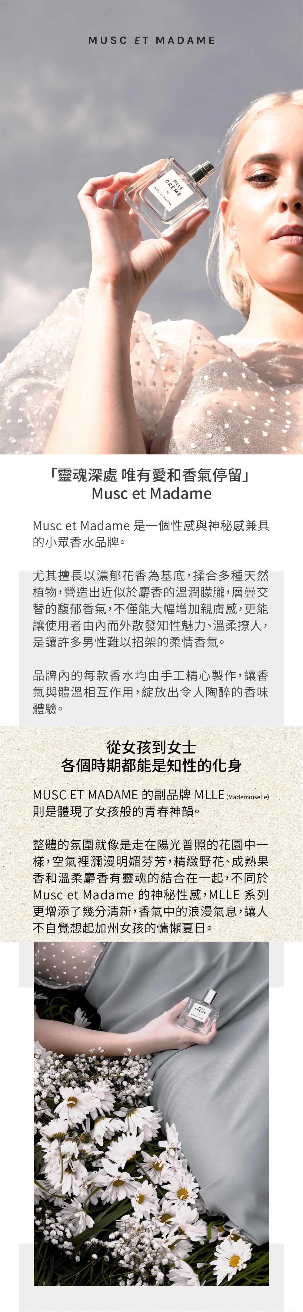 Musc et Madame 是一款同時帶有性感與神秘感的小眾香水系列。以濃郁的花香為基底,搭配原始的動物麝香增加親膚感,由內而外散發出知性魅力、溫柔撩人,是讓許多男性難以招架的香氣。