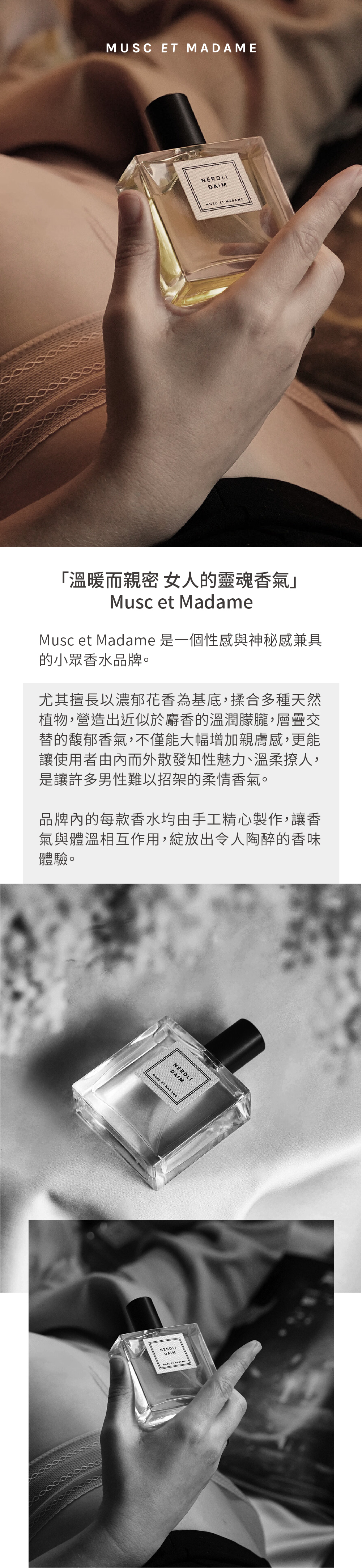 Musc et Madame 是一款同時帶有性感與神秘感的小眾香水系列。以濃郁的花香為基底,搭配原始的動物麝香增加親膚感,由內而外散發出知性魅力、溫柔撩人,是讓許多男性難以招架的香氣。