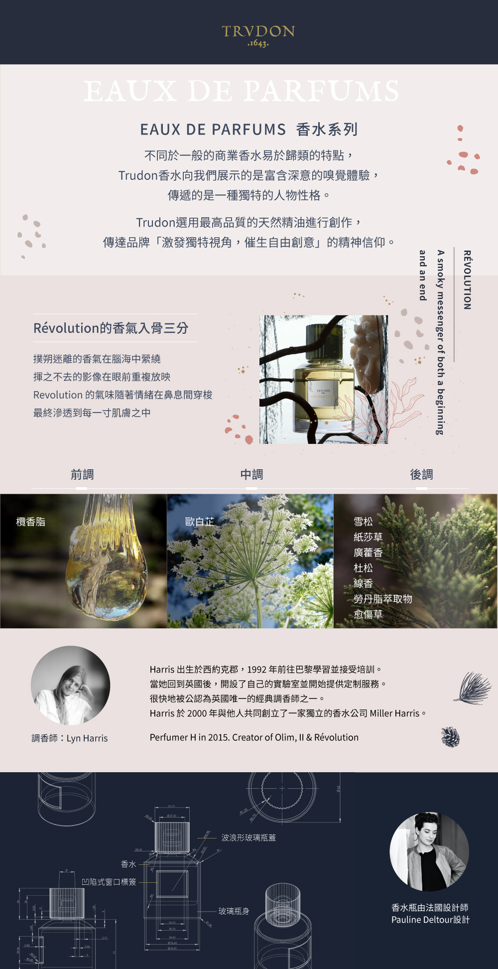 創立於 1643 年的法國皇室香氛品牌 Trudon,選用最高品質的天然精油進行創作,傳達品牌「激發獨特視角,催生自由創意」的精神信仰,Trudon 香水展示的是富含深意的嗅覺體驗,傳遞的是一種獨特的人物性格。