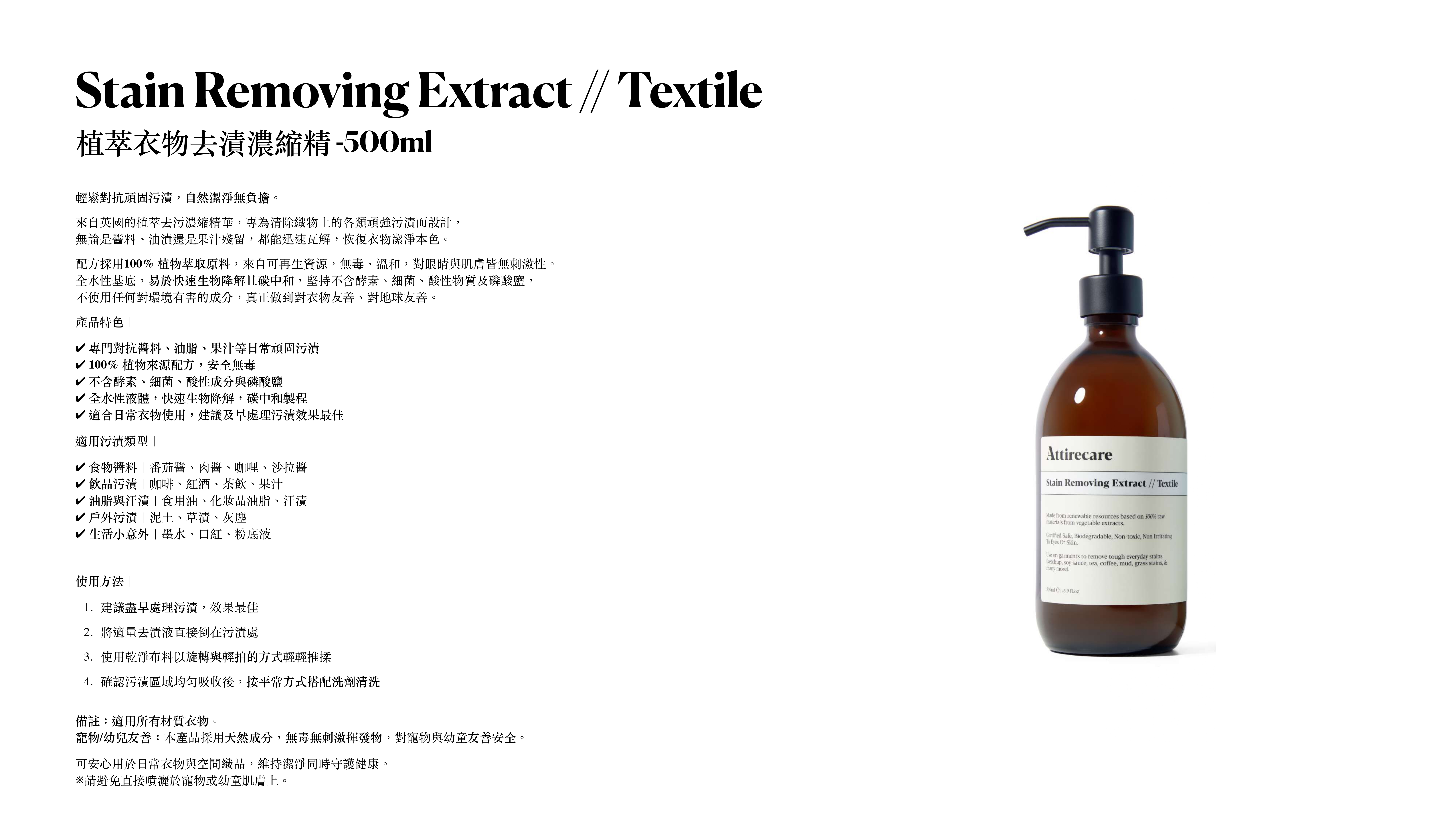衣物織品去污漬濃縮精是一種全水性液體,由100%植物萃取物製成,易於快速生物降解,無毒且對眼睛和皮膚無刺激,能夠迅速去除日常污漬,讓清潔衣物變得簡單而高效,同時呵護環境,確保您的衣物始終保持最佳狀態!