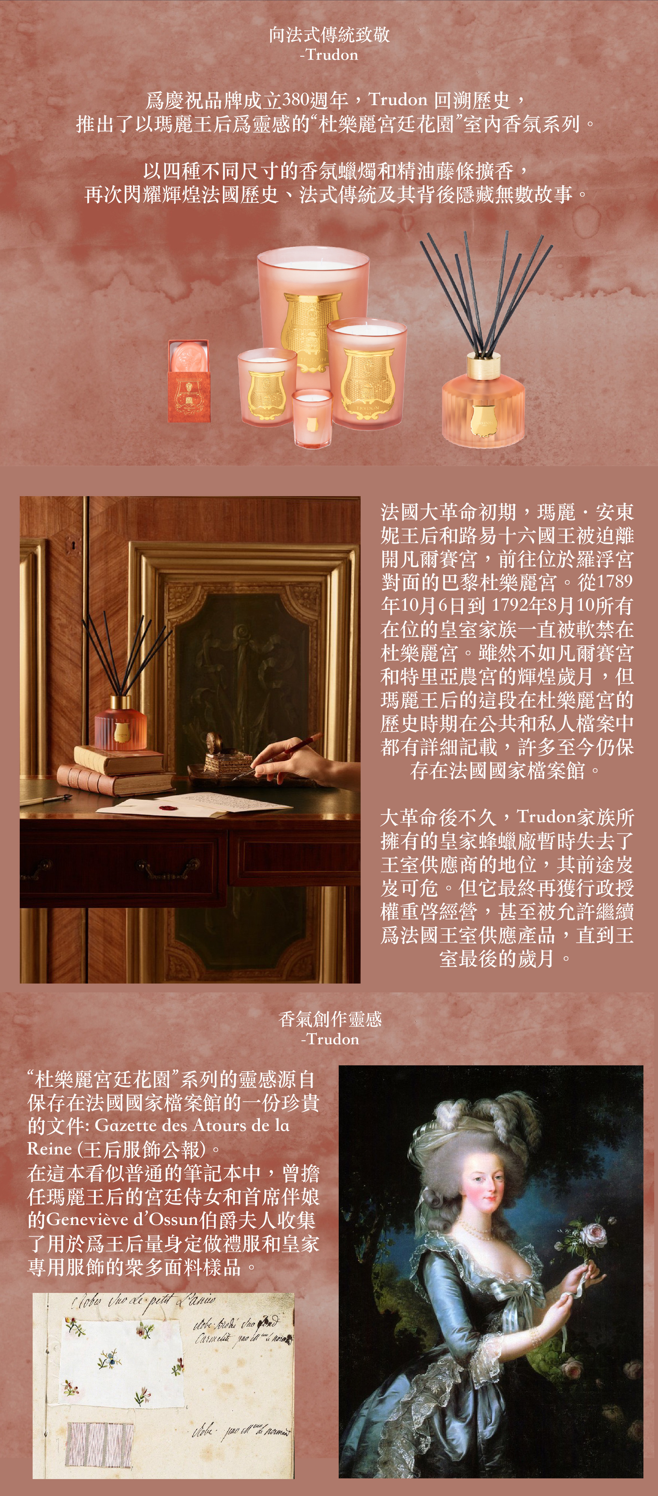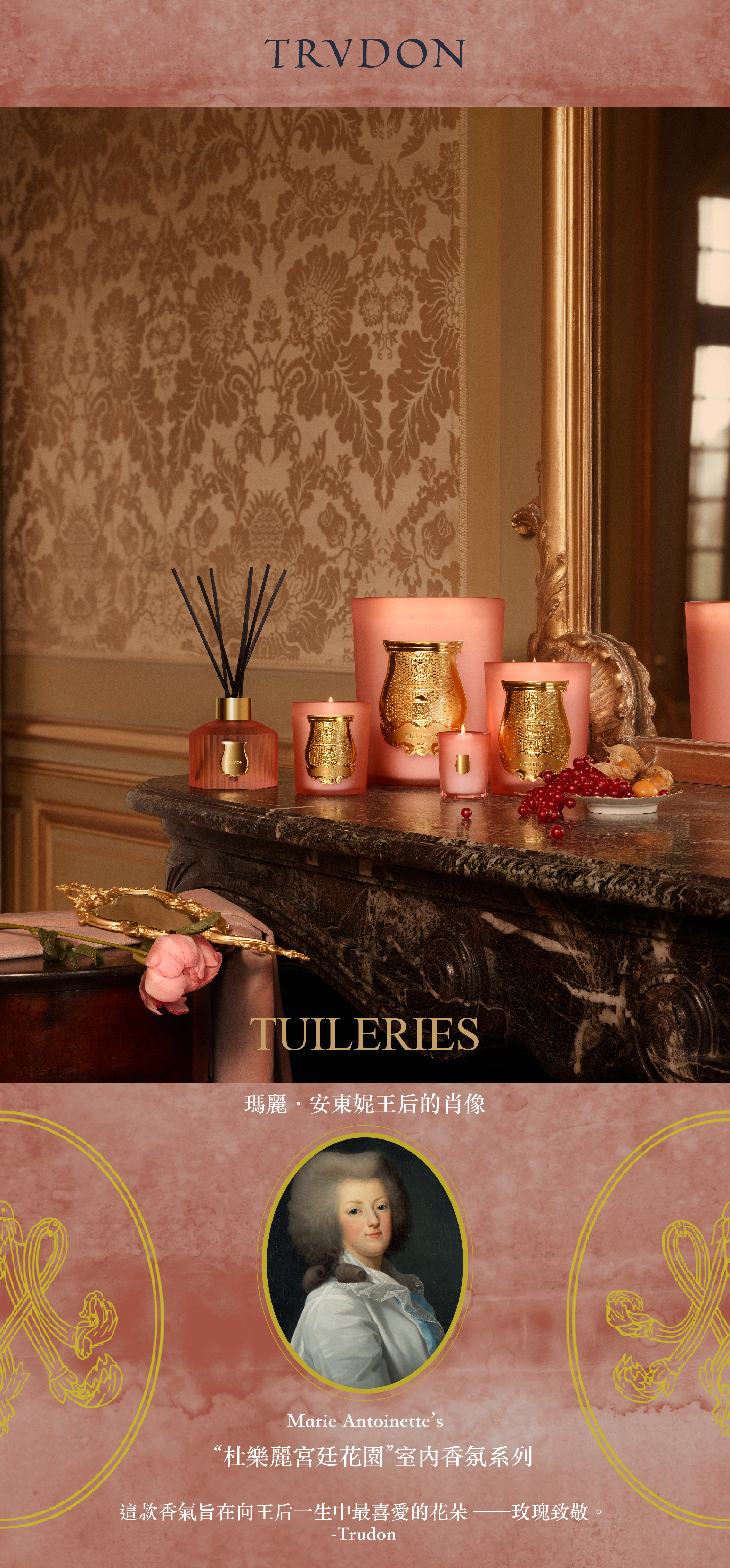 為慶祝品牌成立380週年,Trudon回溯歷史,推出了以瑪麗王后為靈感的“杜樂麗花園”室內香氛系列。