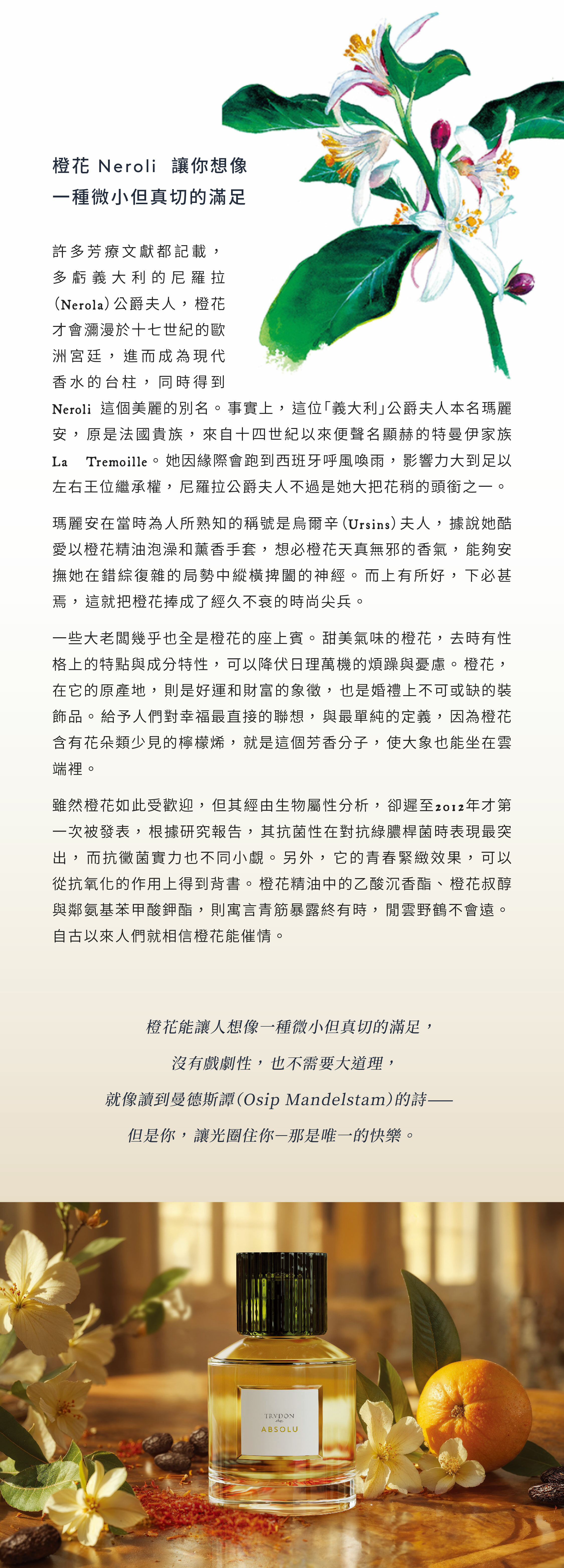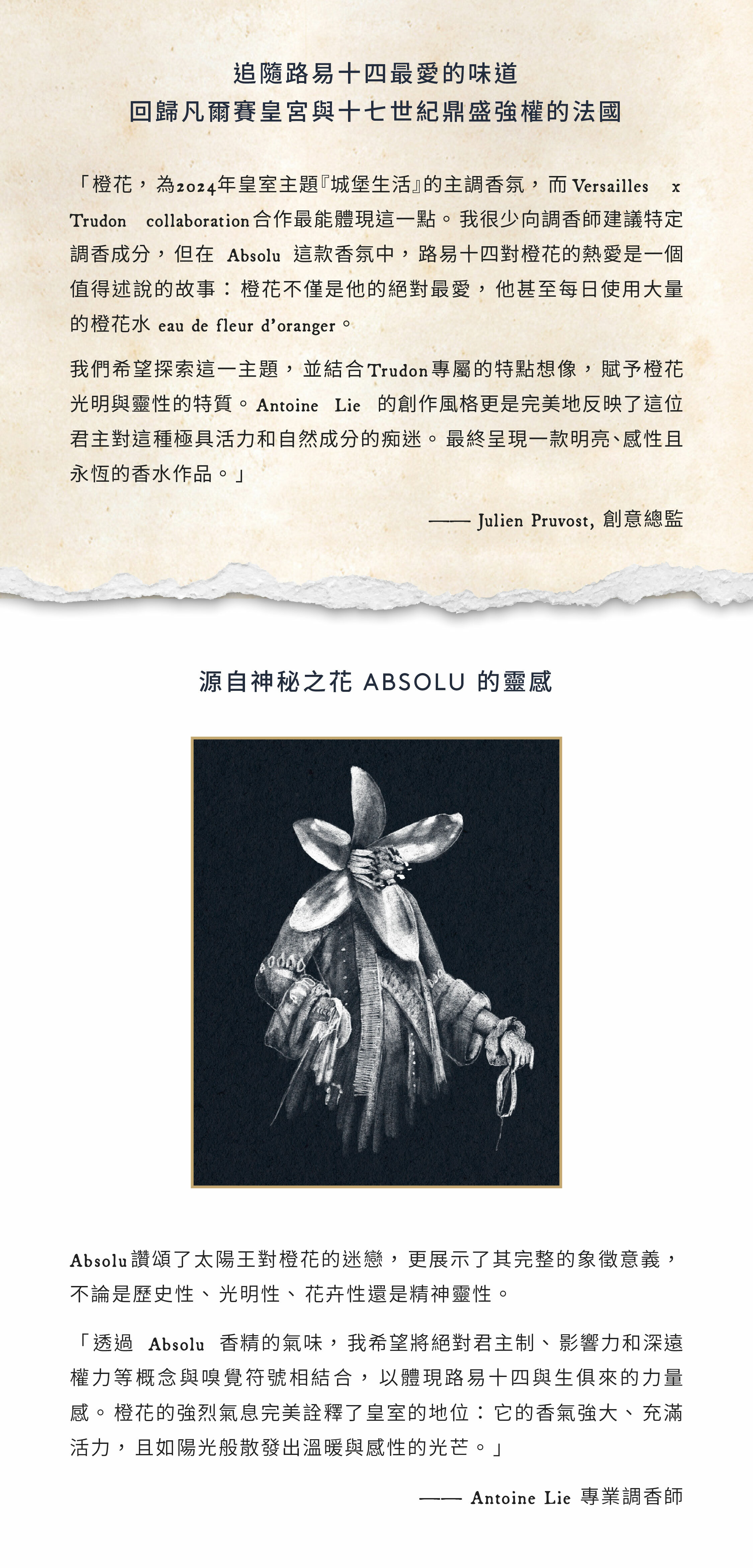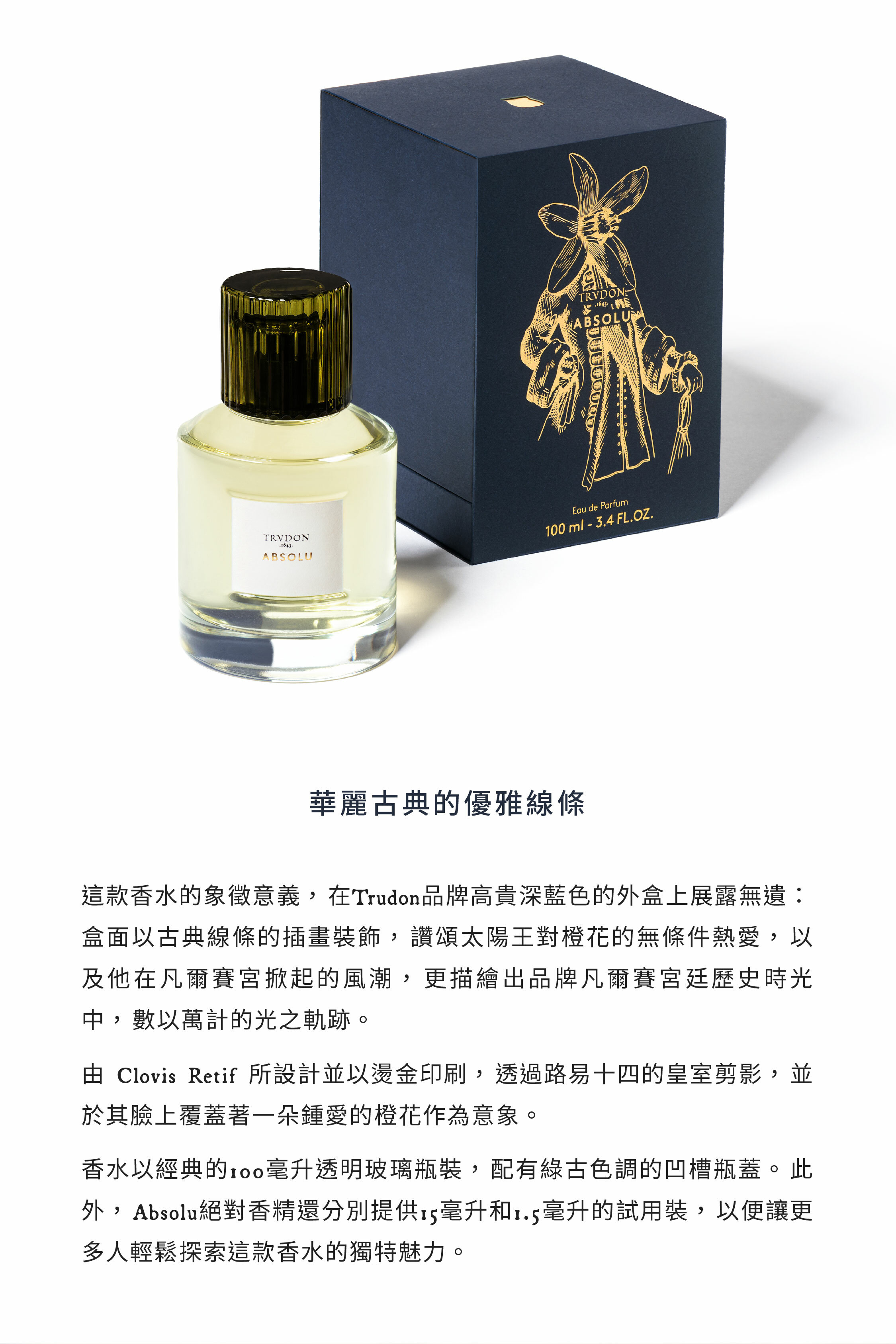 Absolu 太陽王香精 是一款極具象徵意義的香水。Antoine Lie 從凡爾賽宮的柑橘園和橙花的永恆力ᰁ中汲取靈感,創作出一種甜美、濃烈且令人上癮的感性香氣。香水以新鮮而辛辣的前調小荳蔻、柑橘和藏紅花引人入勝。隨著香氣層層展開,溫暖而迷人的中調逐漸顯現,此時橙花精萃成為氣味主角,受到圓潤和感性的襯托,並由鳶尾花的花香和煙燻感的乳香加以提升。強烈而充滿活力的基調則由零陵香豆、雪松和愈創木帶來,留下極度誘人的肌膚感受。