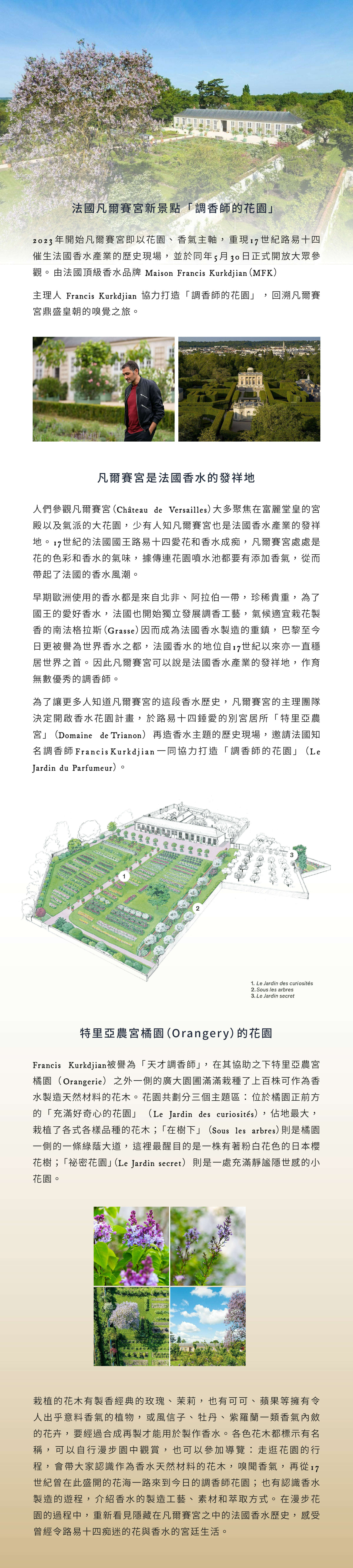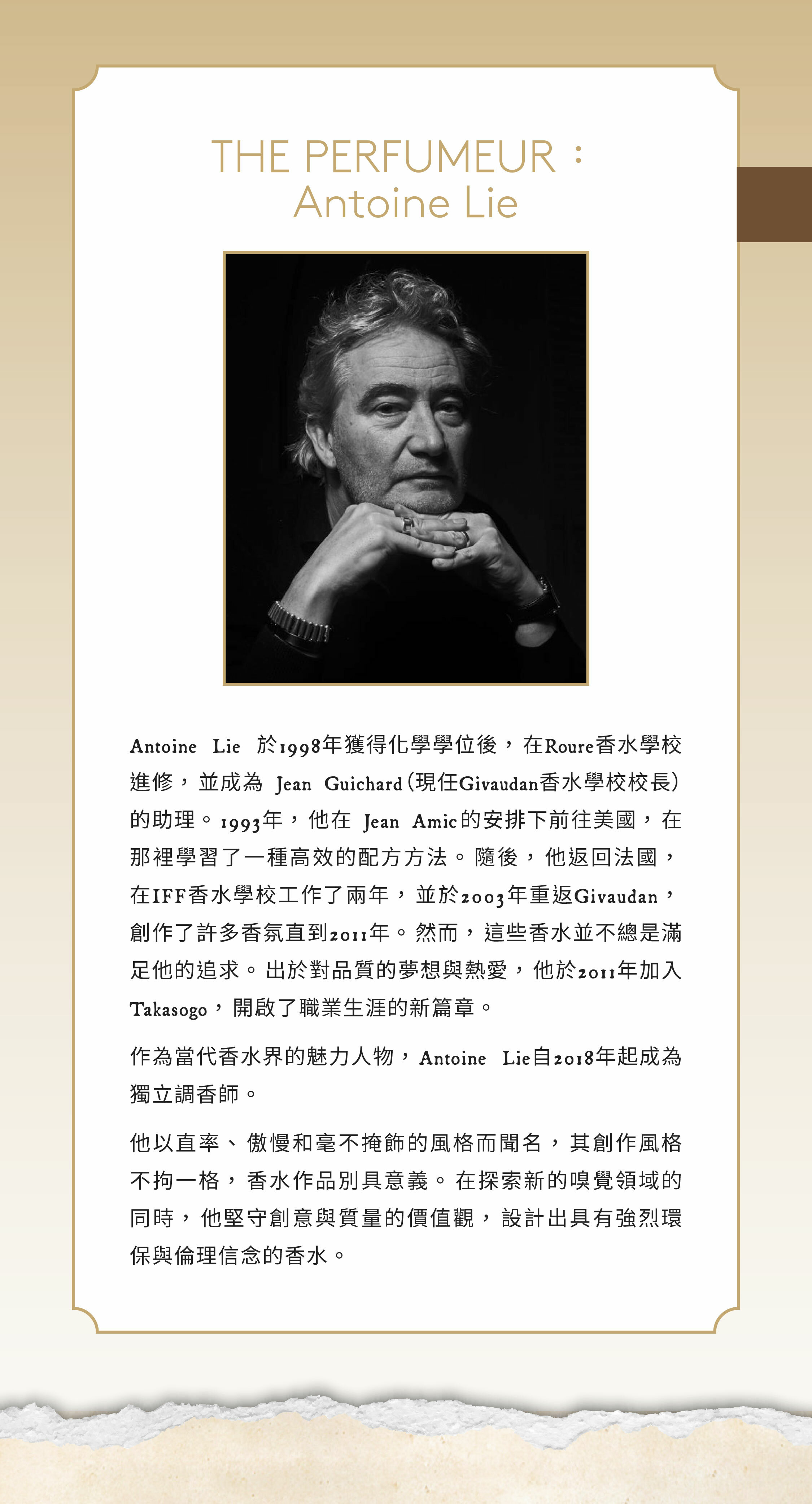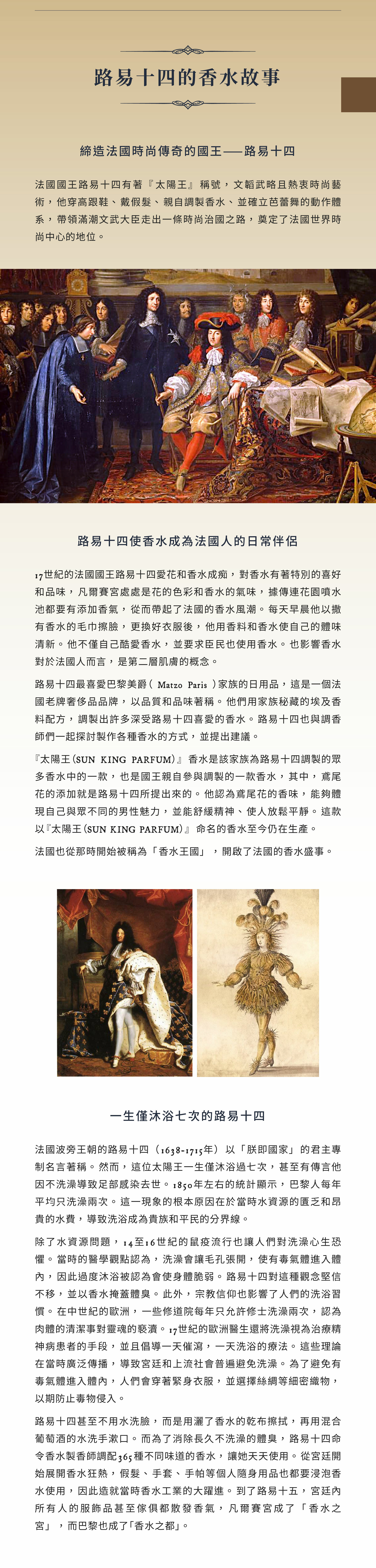 Absolu 太陽王香精 是一款極具象徵意義的香水。Antoine Lie 從凡爾賽宮的柑橘園和橙花的永恆力ᰁ中汲取靈感,創作出一種甜美、濃烈且令人上癮的感性香氣。香水以新鮮而辛辣的前調小荳蔻、柑橘和藏紅花引人入勝。隨著香氣層層展開,溫暖而迷人的中調逐漸顯現,此時橙花精萃成為氣味主角,受到圓潤和感性的襯托,並由鳶尾花的花香和煙燻感的乳香加以提升。強烈而充滿活力的基調則由零陵香豆、雪松和愈創木帶來,留下極度誘人的肌膚感受。
