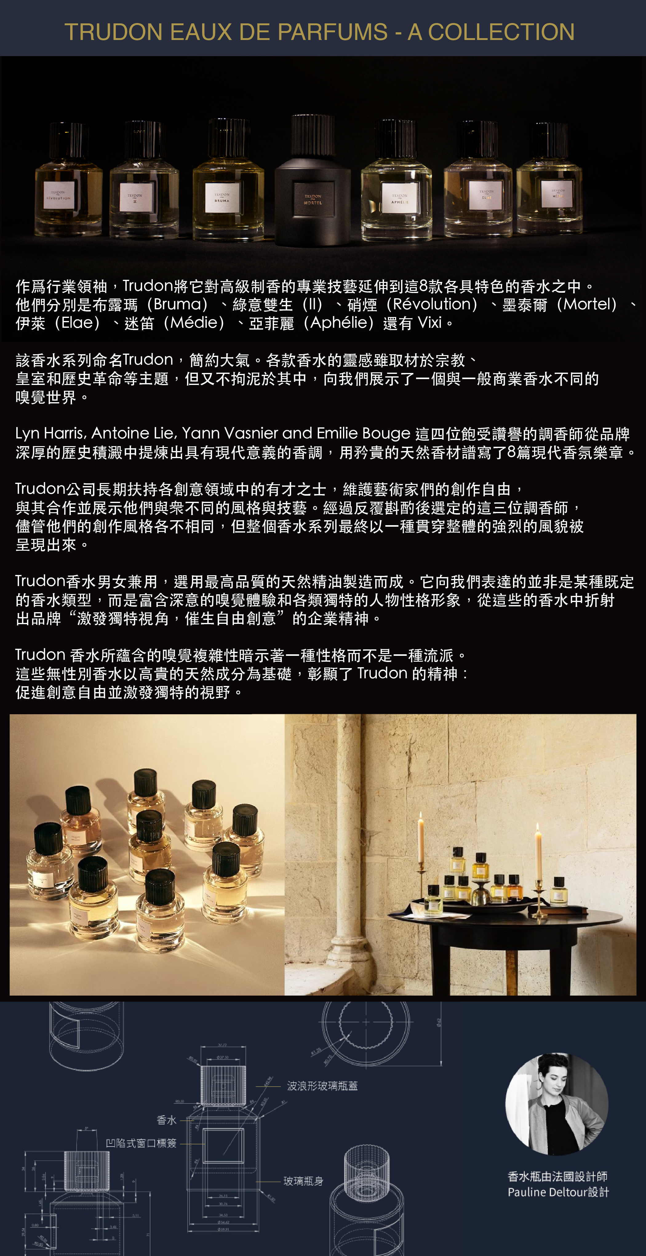 創立於 1643 年的法國皇室香氛品牌 Trudon,選用最高品質的天然精油進行創作,傳達品牌「激發獨特視角,催生自由創意」的精神信仰,Trudon 香水展示的是富含深意的嗅覺體驗,傳遞的是一種獨特的人物性格。