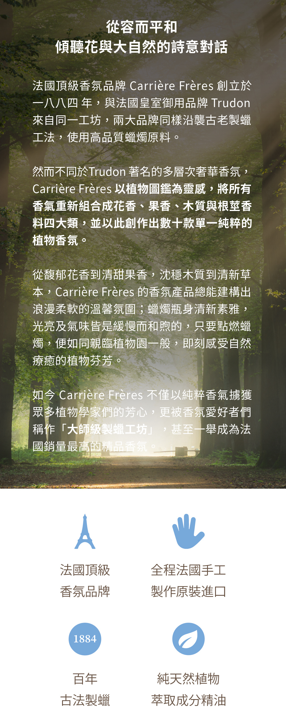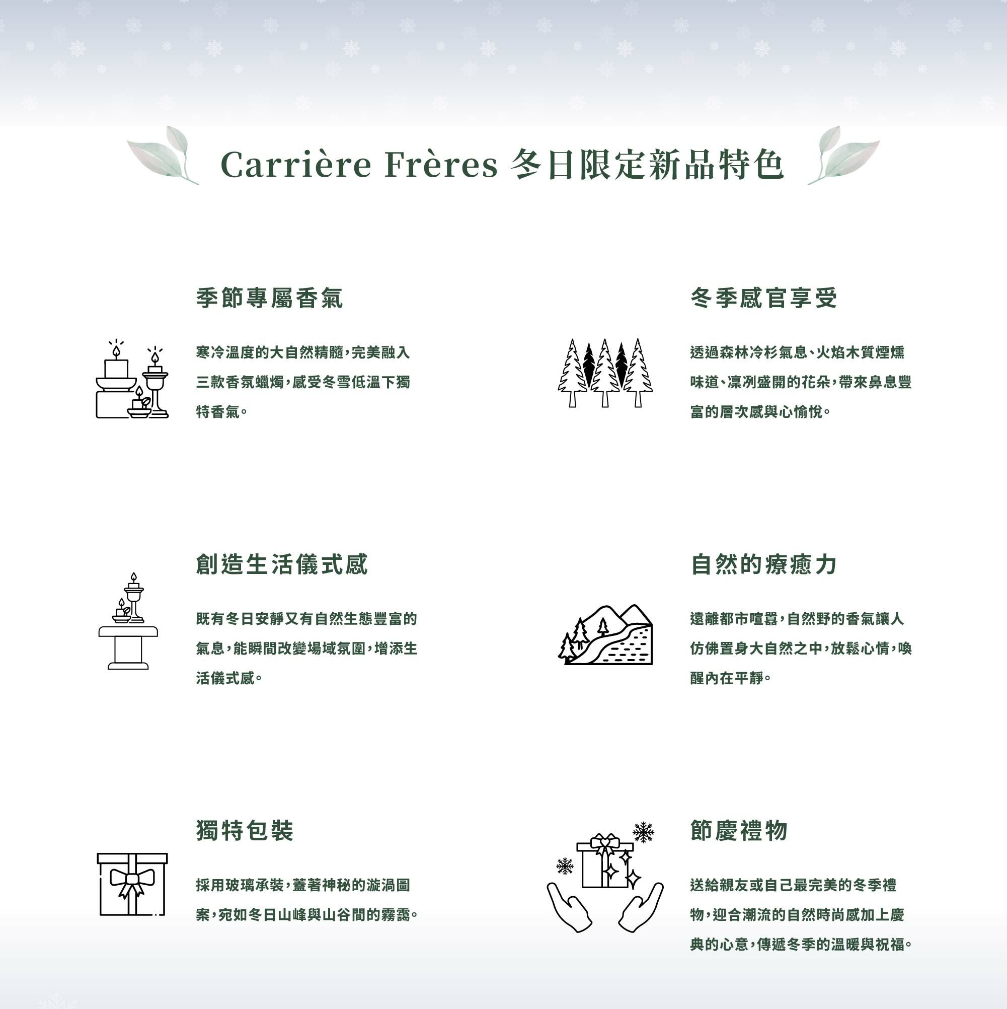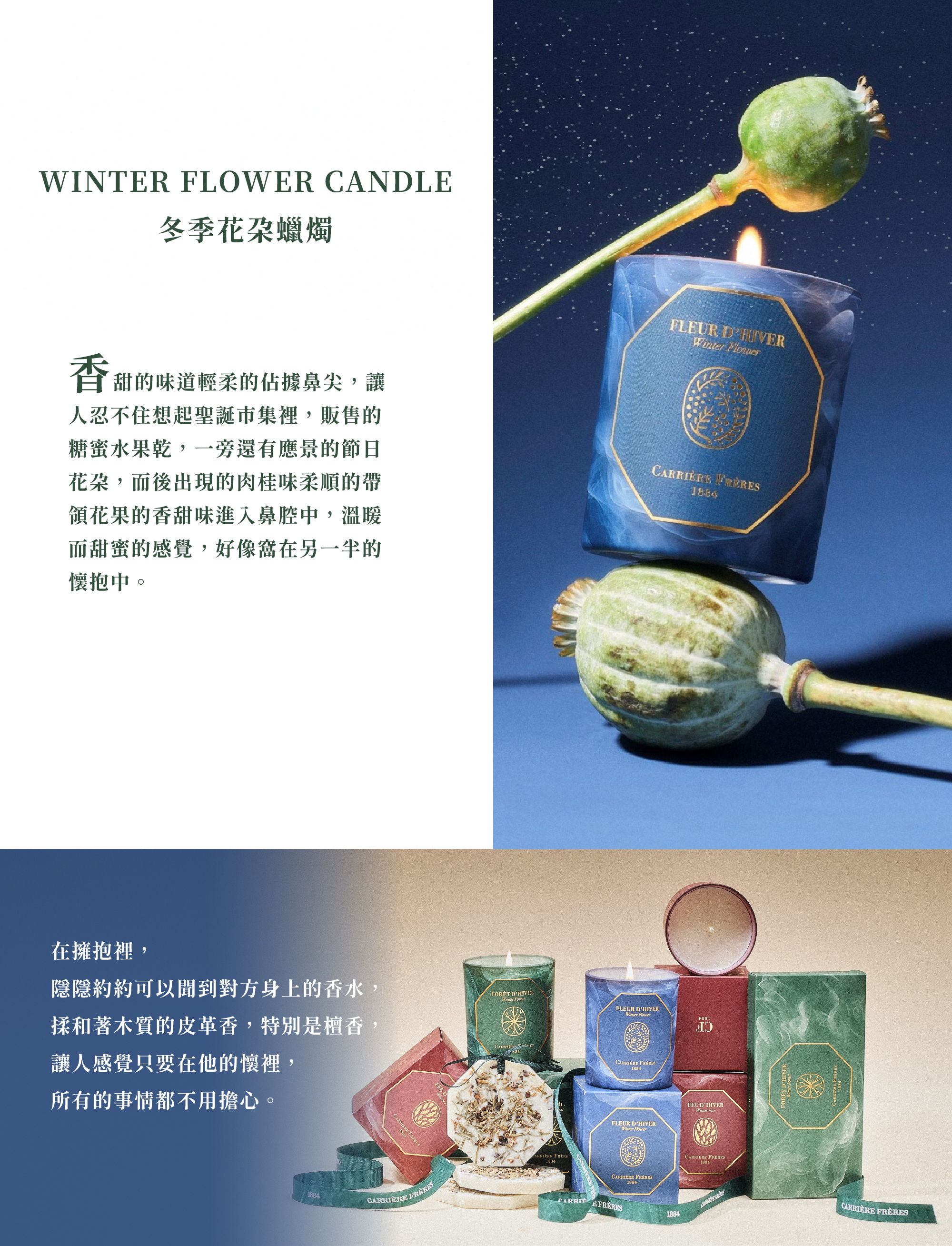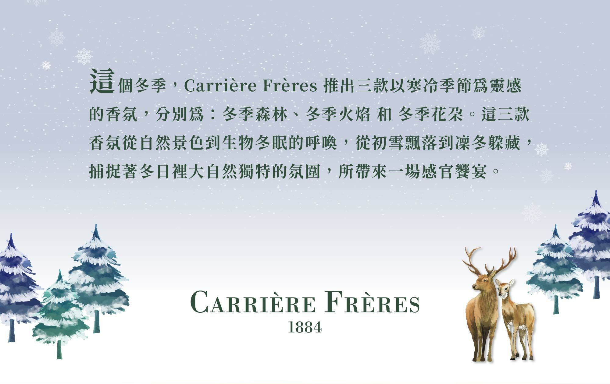 這個冬季,Carrière Frères 推出三款以寒冷季節為靈感的香氛,分別為:冬季森林、冬季火焰 和 冬季花朵。這三款香氛從自然景色到生物冬眠的呼喚,從初雪飄落到凜冬躲藏,捕捉著冬日裡大自然獨特的氛圍,所帶來一場感官饗宴。